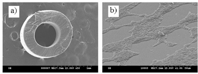 secţiune prin cateter; b) dezvoltarea biofilmului pe suprafaţa
